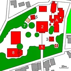 - Beffroi , Shōrō, (kanji :鐘楼) (remarque: les fondations respectives de 6 et 7 sont adjacentes).