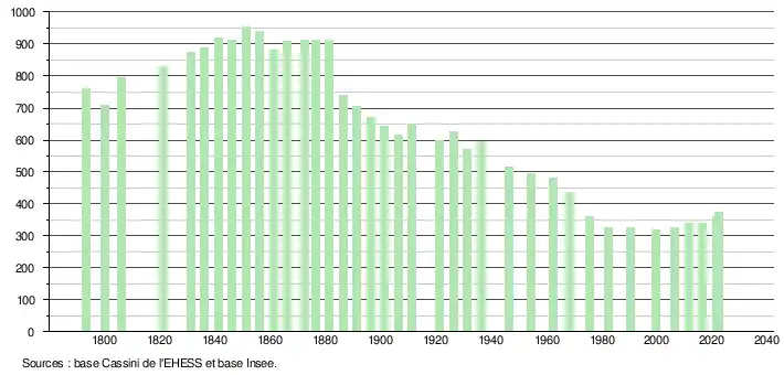 L'évolution du nombre d'habitants est connue à travers les recensements de la population effectués dans la commune depuis 1793. Pour les communes de moins de 10 000 habitants, une enquête de recensement portant sur toute la population est réalisée tous les cinq ans, les populations de référence des années intermédiaires étant quant à elles estimées par interpolation ou extrapolation[17]. Pour la commune, le premier recensement exhaustif entrant dans le cadre du nouveau dispositif a été réalisé en 2006[18].