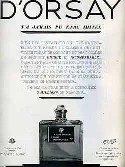 En 1925, les parfums D'Orsay obtiennent une distinction durant l'Exposition internationale des arts décoratifs et industriels modernes. Plus de cinq millions de bouteilles sont vendues en 191.