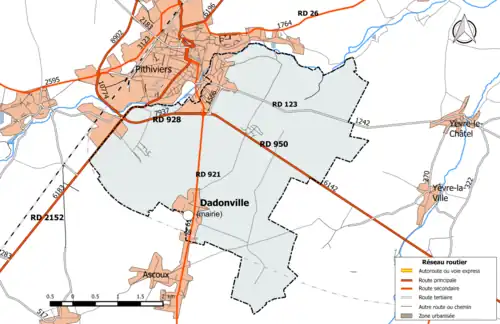 La RD 921, qui constitue l'artère principale du bourg, est l'ancienne route nationale 721, qui reliait avant 1973 Étampes (RN20), Pithiviers, Jargeau et La Ferté-Saint-Aubin (RN20). Elle a été transférée au département du Loiret par arrêté du 22 décembre 2012[39]. En 2014, elle supporte un trafic de 6 152 véhicules/jour[37].