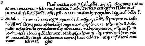 Également dans un autre livre datant de l’époque du pape Jean XV, le Seigneur Dagome et son épouse Oda, ainsi que leurs fils Mieszko et Lambert (Je ne sais pas à quelle tribu appartenaient ces gens mais je pense qu’il s’agit des Sardes puisque ceux-ci sont gouvernés par quatre seigneurs), sont supposés avoir légué à Saint Pierre un état entier, appelé Shinesghe[1], avec toutes les terres frontalières qui en dépendent[2], qui d’un côté longent la mer[3], le long de la Prusse jusqu’à une région appelée la Rus, de là vont jusqu’à Cracovie et ensuite partent en ligne directe jusqu’au fleuve Oder, puis tout droit jusqu’à un lieu appelé Alemure[4], et d’Alemure vont jusqu’au pays de Milczan[5], et de la frontière avec le pays de Milczan jusqu’à la rivière Oder, puis suivent le cours de l’Oder jusqu’à l’État de Shinesghe mentionné plus haut.