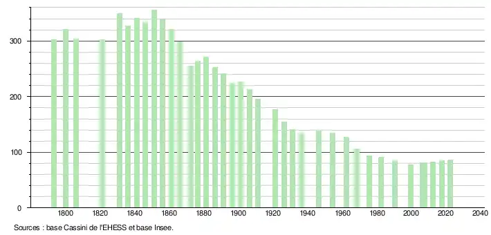 L'évolution du nombre d'habitants est connue à travers les recensements de la population effectués dans la commune depuis 1793. Pour les communes de moins de 10 000 habitants, une enquête de recensement portant sur toute la population est réalisée tous les cinq ans, les populations de référence des années intermédiaires étant quant à elles estimées par interpolation ou extrapolation[18]. Pour la commune, le premier recensement exhaustif entrant dans le cadre du nouveau dispositif a été réalisé en 2007[19].