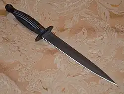 Voir le mot poignard, également arme blanche courte à double tranchant ; la dague serait plus longue que le poignard (traduit dagger en anglais).
