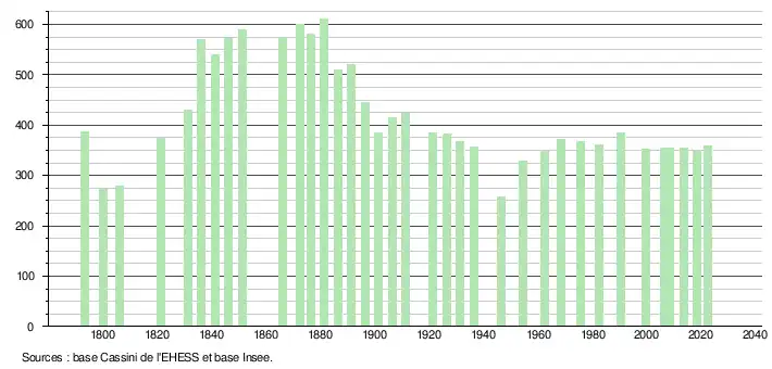 L'évolution du nombre d'habitants est connue à travers les recensements de la population effectués dans la commune depuis 1793. Pour les communes de moins de 10 000 habitants, une enquête de recensement portant sur toute la population est réalisée tous les cinq ans, les populations de référence des années intermédiaires étant quant à elles estimées par interpolation ou extrapolation[19]. Pour la commune, le premier recensement exhaustif entrant dans le cadre du nouveau dispositif a été réalisé en 2008[20].