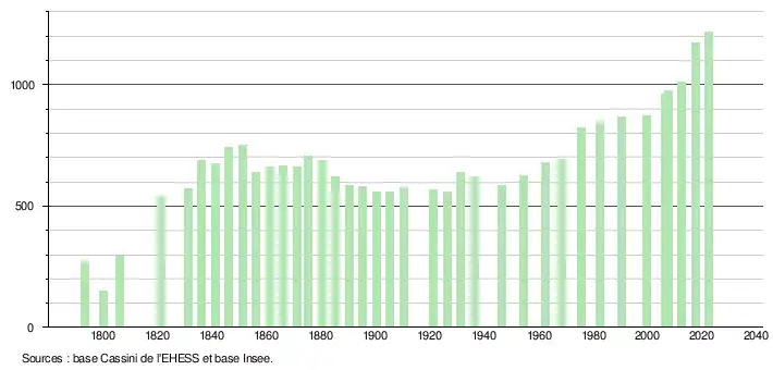 L'évolution du nombre d'habitants est connue à travers les recensements de la population effectués dans la commune depuis 1793. Pour les communes de moins de 10 000 habitants, une enquête de recensement portant sur toute la population est réalisée tous les cinq ans, les populations de référence des années intermédiaires étant quant à elles estimées par interpolation ou extrapolation[23]. Pour la commune, le premier recensement exhaustif entrant dans le cadre du nouveau dispositif a été réalisé en 2007[24].