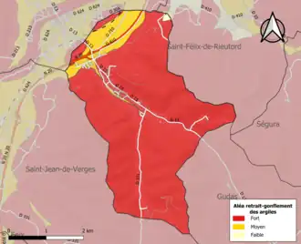 Les mouvements de terrains susceptibles de se produire sur la commune sont soit des chutes de blocs, soit des glissements de terrains, soit des mouvements liés au retrait-gonflement des argiles. Près de 50 % de la superficie du département est concernée par l'aléa retrait-gonflement des argiles, dont la commune de Dalou[35]. L'inventaire national des cavités souterraines permet par ailleurs de localiser celles situées sur la commune[36].