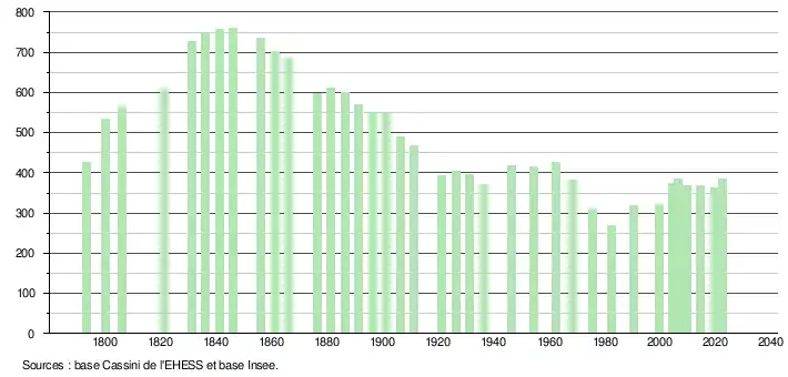L'évolution du nombre d'habitants est connue à travers les recensements de la population effectués dans la commune depuis 1793. Pour les communes de moins de 10 000 habitants, une enquête de recensement portant sur toute la population est réalisée tous les cinq ans, les populations de référence des années intermédiaires étant quant à elles estimées par interpolation ou extrapolation[25]. Pour la commune, le premier recensement exhaustif entrant dans le cadre du nouveau dispositif a été réalisé en 2004[26].