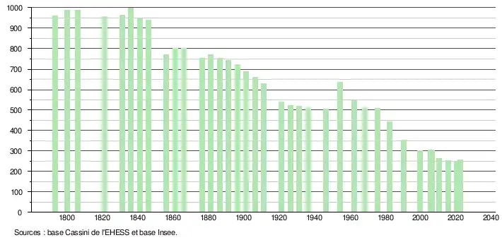 L'évolution du nombre d'habitants est connue à travers les recensements de la population effectués dans la commune depuis 1793. Pour les communes de moins de 10 000 habitants, une enquête de recensement portant sur toute la population est réalisée tous les cinq ans, les populations de référence des années intermédiaires étant quant à elles estimées par interpolation ou extrapolation[29]. Pour la commune, le premier recensement exhaustif entrant dans le cadre du nouveau dispositif a été réalisé en 2005[30].