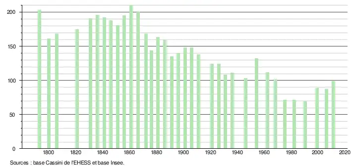 - ↑ Par convention dans Wikipédia, le principe a été retenu de n’afficher dans le tableau des recensements et le graphique, pour les populations légales postérieures à 1999, que les populations correspondant à une enquête exhaustive de recensement pour les communes de moins de 10 000 habitants, et que les populations des années 2006, 2011, 2016, etc. pour les communes de plus de 10 000 habitants, ainsi que la dernière population légale publiée par l’Insee pour l'ensemble des communes.
