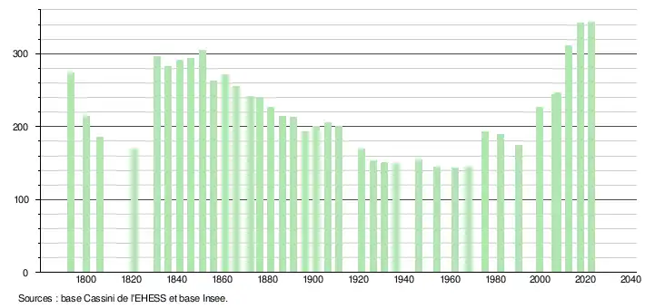 L'évolution du nombre d'habitants est connue à travers les recensements de la population effectués dans la commune depuis 1793. Pour les communes de moins de 10 000 habitants, une enquête de recensement portant sur toute la population est réalisée tous les cinq ans, les populations de référence des années intermédiaires étant quant à elles estimées par interpolation ou extrapolation[15]. Pour la commune, le premier recensement exhaustif entrant dans le cadre du nouveau dispositif a été réalisé en 2007[16].