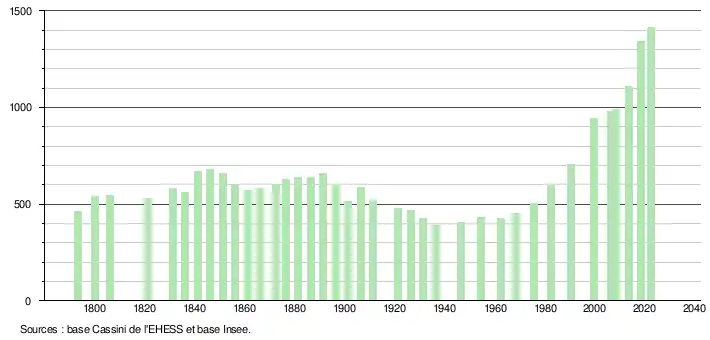 L'évolution du nombre d'habitants est connue à travers les recensements de la population effectués dans la commune depuis 1793. Pour les communes de moins de 10 000 habitants, une enquête de recensement portant sur toute la population est réalisée tous les cinq ans, les populations de référence des années intermédiaires étant quant à elles estimées par interpolation ou extrapolation[24]. Pour la commune, le premier recensement exhaustif entrant dans le cadre du nouveau dispositif a été réalisé en 2008[25].