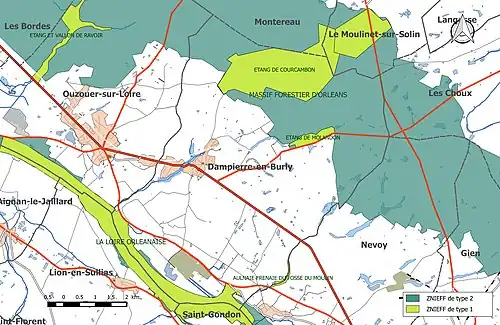 La zone s'étend sur 37 communes, dont Dampierre-en-Burly, et se superpose pour la commune à la zone Natura 2000 de même nom[DREAL 4]. Son altitude varie entre 126 et 174 m[INPN 15]. La forêt d'Orléans repose pour l'essentiel sur des terrains de nature comparable à celle des terrains de la Sologne (Burdigalien) épandus sur le coteau de Beauce. Les formations végétales sont donc plutôt acidoclines à acidiphiles avec des secteurs secs et d'autres très humides. L'intérêt dépasse les contours complexes du massif domanial et s'étend également aux lisières et enclaves privées qui le prolongent[INPN 16].
