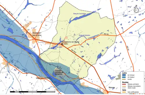 Le val de Dampierre s’étend en rive droite de la Loire face à Lion-en-Sullias, sur une longueur totale de 4 km environ et une largeur de 1,5 km. Le territoire de la commune de Dampierre-en-Burly y est partiellement situé en zone inondable. L’occupation du sol est partagée entre l’agriculture et la centrale nucléaire[52]. Le système d'endiguement du val de Dampierre est composé de plusieurs levées domaniales, de levées appartenant à EDF et au Conseil départemental du Loiret (RD 953) pour une longueur d'environ 5,7 km. Il protège environ 25 personnes. Le niveau de protection du val correspond au niveau de la mise en fonctionnement du déversoir de Pierrelaye à partir de la crue d’occurrence 60 ans (environ 5,7 m à l'échelle de Gien). Toutefois, la zone protégée commence à être inondée par remous dès la crue quinquennale (environ 5,3 m à l'échelle de Gien).