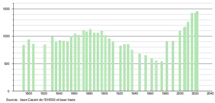 L'évolution du nombre d'habitants est connue à travers les recensements de la population effectués dans la commune depuis 1793. Pour les communes de moins de 10000habitants, une enquête de recensement portant sur toute la population est réalisée tous les cinqans, les populations de référence des années intermédiaires étant quant à elles estimées par interpolation ou extrapolation[115]. Pour la commune, le premier recensement exhaustif entrant dans le cadre du nouveau dispositif a été réalisé en 2005[116].