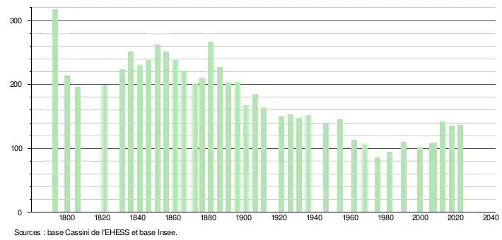 L'évolution du nombre d'habitants est connue à travers les recensements de la population effectués dans la commune depuis 1793. Pour les communes de moins de 10 000 habitants, une enquête de recensement portant sur toute la population est réalisée tous les cinq ans, les populations de référence des années intermédiaires étant quant à elles estimées par interpolation ou extrapolation[14]. Pour la commune, le premier recensement exhaustif entrant dans le cadre du nouveau dispositif a été réalisé en 2007[15].