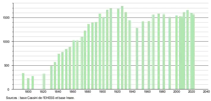 L'évolution du nombre d'habitants est connue à travers les recensements de la population effectués dans la commune depuis 1793. Pour les communes de moins de 10 000 habitants, une enquête de recensement portant sur toute la population est réalisée tous les cinq ans, les populations de référence des années intermédiaires étant quant à elles estimées par interpolation ou extrapolation[18]. Pour la commune, le premier recensement exhaustif entrant dans le cadre du nouveau dispositif a été réalisé en 2004[19].