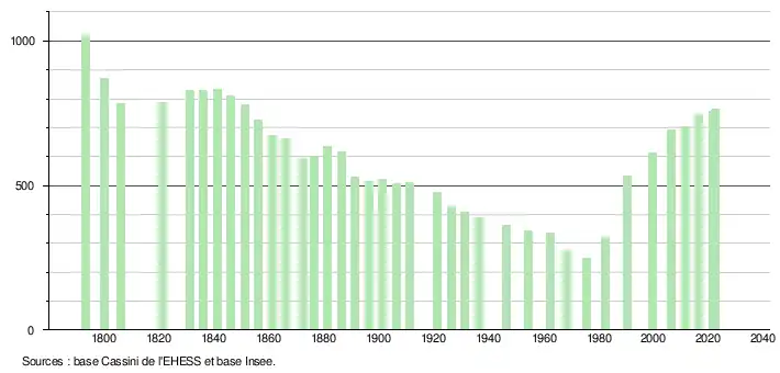L'évolution du nombre d'habitants est connue à travers les recensements de la population effectués dans la commune depuis 1793. Pour les communes de moins de 10 000 habitants, une enquête de recensement portant sur toute la population est réalisée tous les cinq ans, les populations de référence des années intermédiaires étant quant à elles estimées par interpolation ou extrapolation[27]. Pour la commune, le premier recensement exhaustif entrant dans le cadre du nouveau dispositif a été réalisé en 2006[28].