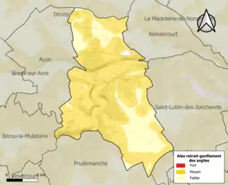 Le retrait-gonflement des sols argileux est susceptible d'engendrer des dommages importants aux bâtiments en cas d’alternance de périodes de sécheresse et de pluie. 78,2 % de la superficie communale est en aléa moyen ou fort (52,8 % au niveau départemental et 48,5 % au niveau national). Sur les 385 bâtiments dénombrés sur la commune en 2019, 311 sont en aléa moyen ou fort, soit 81 %, à comparer aux 70 % au niveau départemental et 54 % au niveau national. Une cartographie de l'exposition du territoire national au retrait gonflement des sols argileux est disponible sur le site du BRGM[19],[Carte 2].