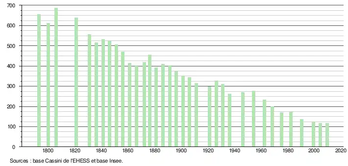 - ↑ Par convention dans Wikipédia, le principe a été retenu de n’afficher dans le tableau des recensements et le graphique, pour les populations légales postérieures à 1999, que les populations correspondant à une enquête exhaustive de recensement pour les communes de moins de 10 000 habitants, et que les populations des années 2006, 2011, 2016, etc. pour les communes de plus de 10 000 habitants, ainsi que la dernière population légale publiée par l’Insee pour l'ensemble des communes.