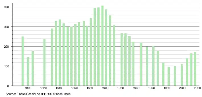 L'évolution du nombre d'habitants est connue à travers les recensements de la population effectués dans la commune depuis 1793. Pour les communes de moins de 10 000 habitants, une enquête de recensement portant sur toute la population est réalisée tous les cinq ans, les populations de référence des années intermédiaires étant quant à elles estimées par interpolation ou extrapolation[4]. Pour la commune, le premier recensement exhaustif entrant dans le cadre du nouveau dispositif a été réalisé en 2006[5].