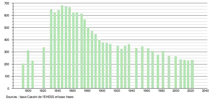 L'évolution du nombre d'habitants est connue à travers les recensements de la population effectués dans la commune depuis 1793. Pour les communes de moins de 10 000 habitants, une enquête de recensement portant sur toute la population est réalisée tous les cinq ans, les populations de référence des années intermédiaires étant quant à elles estimées par interpolation ou extrapolation[26]. Pour la commune, le premier recensement exhaustif entrant dans le cadre du nouveau dispositif a été réalisé en 2006[27].