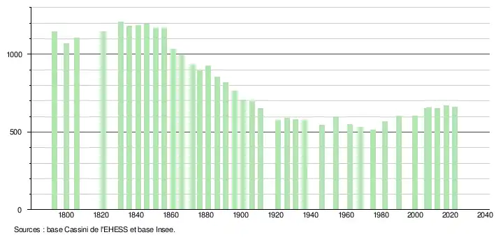 L'évolution du nombre d'habitants est connue à travers les recensements de la population effectués dans la commune depuis 1793. Pour les communes de moins de 10 000 habitants, une enquête de recensement portant sur toute la population est réalisée tous les cinq ans, les populations de référence des années intermédiaires étant quant à elles estimées par interpolation ou extrapolation[35]. Pour la commune, le premier recensement exhaustif entrant dans le cadre du nouveau dispositif a été réalisé en 2007[36].