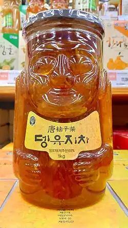 Le fruit a une utilisation rituelle[24] de présent devant l'autel des ancêtres[14]. En Corée, où l'habitude de boire des tisanes sucrées à base de marmelade de fruit et de sucre est généralisée, le thé de Danyuja 당유자에이드 (dang-yuja-eideu) se fait en décoction[25] avec l'eau bouillante ou en infusion froide y compris gazeuse[26].