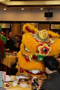 Durant le Nouvel An chinois, des troupes de danse du lion venant d'écoles d'arts martiaux visitent souvent les maisons et les boutiques de la communauté chinoise pour la coutume traditionnelle du « cai qing » (採青, littéralement « cueillir les verts »), durant laquelle le lion attrape des légumes verts ou des salades, censés porter chance[53], qui sont soit accrochés à une perche, soit placés sur une table devant la porte. Les « verts » sont liés par une « enveloppe rouge » contenant de l'argent, et peuvent aussi contenir des fruits de bon augure, comme des oranges. Le lion danse et s'approche de la verdure et de l'enveloppe rouge comme un chat curieux ; il « mange le vert » et le recrache, mais garde l'enveloppe, qui est la récompense de la troupe. La danse est censée apportée chance au commerce, mais sous la dynastie Qing, d'autres significations étaient sans doute associées à ce rituel, les « verts » (qing) pouvant avoir représenté le pouvoir[54].