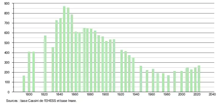L'évolution du nombre d'habitants est connue à travers les recensements de la population effectués dans la commune depuis 1793. Pour les communes de moins de 10 000 habitants, une enquête de recensement portant sur toute la population est réalisée tous les cinq ans, les populations de référence des années intermédiaires étant quant à elles estimées par interpolation ou extrapolation[24]. Pour la commune, le premier recensement exhaustif entrant dans le cadre du nouveau dispositif a été réalisé en 2007[25].