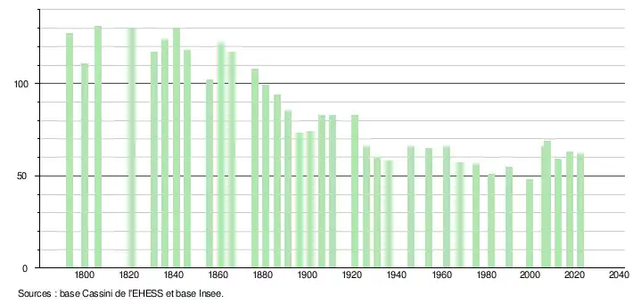 L'évolution du nombre d'habitants est connue à travers les recensements de la population effectués dans la commune depuis 1793. Pour les communes de moins de 10 000 habitants, une enquête de recensement portant sur toute la population est réalisée tous les cinq ans, les populations de référence des années intermédiaires étant quant à elles estimées par interpolation ou extrapolation[17]. Pour la commune, le premier recensement exhaustif entrant dans le cadre du nouveau dispositif a été réalisé en 2007[18].