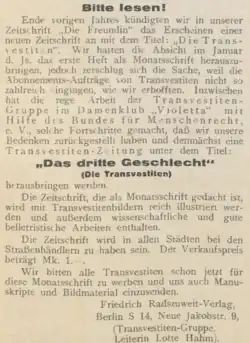 Radszuweit cherche, par solidarité[1] et par intérêt économique[2], à organiser les travestis sur le modèle du mouvement homosexuel, représenté par exemple par le Bund für Menschenrecht, dont il est lui-même président. Il essaie à plusieurs reprises de fonder des organisations spécialement consacrées aux travestis au sein du Bund für Menschenrecht. Un groupe spécifique (Sondergruppe) existe brièvement vers 1929, qui pourrait servir de niche économique et de réserve d'abonnés pour la publication du journal[3]. En 1930, une publicité dans Die Freundin se félicite du travail de ce groupe et annonce la création d'un journal mensuel, Das 3. Geschlecht, richement illustré, pour le prix de 1 M.; la même annonce encourage les travestis à envoyer des images et des textes à la rédaction.