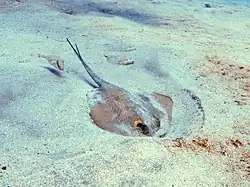 La pastenague commune chasse à l'affût, enfouie dans le sable[6].