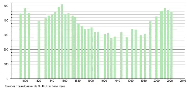 L'évolution du nombre d'habitants est connue à travers les recensements de la population effectués dans la commune depuis 1793. Pour les communes de moins de 10 000 habitants, une enquête de recensement portant sur toute la population est réalisée tous les cinq ans, les populations de référence des années intermédiaires étant quant à elles estimées par interpolation ou extrapolation[27]. Pour la commune, le premier recensement exhaustif entrant dans le cadre du nouveau dispositif a été réalisé en 2007[28].