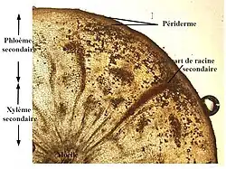 Coupe transversale de la racine montrant le phloème secondaire hypertrophié.