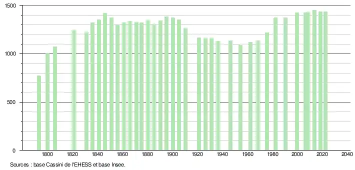 L'évolution du nombre d'habitants est connue à travers les recensements de la population effectués dans la commune depuis 1793. Pour les communes de moins de 10 000 habitants, une enquête de recensement portant sur toute la population est réalisée tous les cinq ans, les populations de référence des années intermédiaires étant quant à elles estimées par interpolation ou extrapolation[23]. Pour la commune, le premier recensement exhaustif entrant dans le cadre du nouveau dispositif a été réalisé en 2008[24].
