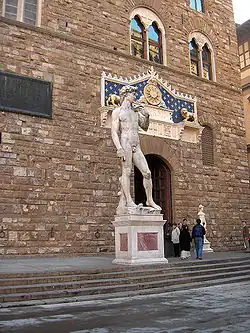 Initialement placé devant le palazzo Vecchio pour symboliser la détermination d'une jeune république face au tyran, l'original est, depuis 1873, exposé dans la Galleria dell'Accademia de Florence. Le David que l'on peut désormais voir devant la façade du palazzo Vecchio est une réplique installée en 1910.