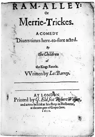 Barry est connu comme l'auteur d'une unique comédie en cinq actes et en vers blancs, Ram Alley ; or Merry Trickes (entrée au Stationer's Registers le [4]), publiée en 1611[2], puis en 1636 et en 1639[4]. Elle a été incluse dans la seconde édition et les suivantes de Old Plays de Robert Dodsley. La page de titre indique qu'elle a été jouée plusieurs fois avant 1611 par la troupe Children of the King's Revels. Lawrence estime que c'est « une pièce que Middleton n'aurait pas démérité d'écrire[4] ». Le Dictionary of National Biography signale qu'elle a longtemps été attribuée à Massinger[3].
