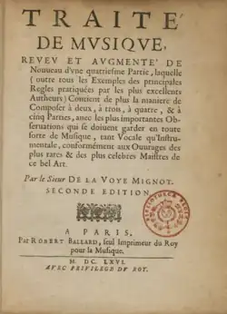 - Traité de musique , reveu et augmenté de nouveau d'une quatriesme partie laquelle (outre tous les exemples des principales regles pratiquées par les plus excellents autheurs) contient de plus la manière de composer à deux, à trois, à quatre, & à cinq parties, avec les plus importantes observations qui se doivent garder en toute sorte de musique, tant vocale qu'instrumentale, conformément aux ouvrages des plus rares & des plus célèbres maistres de ce bel art, seconde édition, Paris : Robert III Ballard, 1666 (lire en ligne).