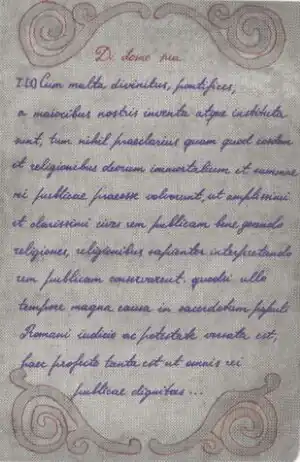 Cicéron gagne la cause. Le collège des pontifes lève la consécration du lieu[20] : « Si celui qui déclarait avoir consacré le terrain n'en avait été nommément chargé ni par un vote des comices ni par un plébiscite, si aucun vote des comices ni plébiscite ne l'y avait invité, il paraissait qu'on pouvait, sans enfreindre une interdiction religieuse, acheter, restituer ce terrain. »[21]