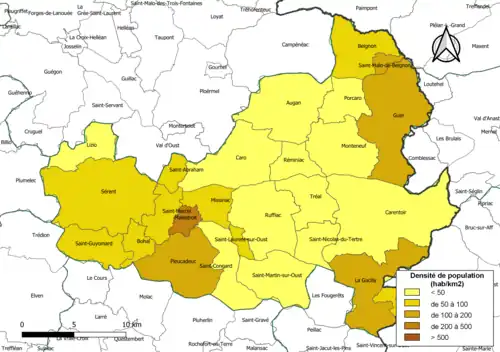 | Saint-Guyomard | 56219 | Guyomardais | 19,66 | 1 446 (2022) | 74 |