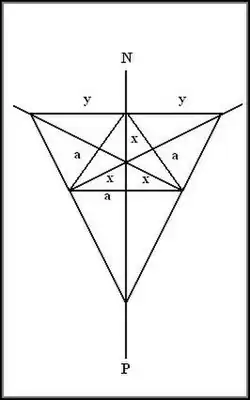 « Soit x la médiane prolongement d'une des Personnes a, 2y le côté du triangle auquel elle est perpendiculaire, N et P les prolongements de la droite (a+x) dans les deux sens à l'infini.