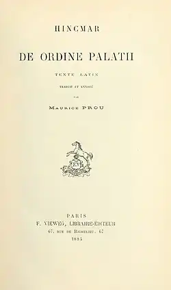 - De ordine palatii. Hinkmar von Reims ; herausgegeben und übersetzt von Thomas Gross und Rudolf Schieffer, Hanovre, Hahn, 1980 (collection : Monumenta Germaniae historica. Fontes juris Germanici antiqui), 119 p. (ISBN 3-7752-5127-8) ; texte latin et traduction en allemand Lire en ligne[10].