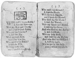 The Death and Burial of Poor Cock Robin a été publiée pour la première fois en 1744 à Londres dans Tommy Thumb's Pretty Song Booktrad. On peut traduire par Le mariage de Rouge-Gorge et Jenny Wren et La Mort et l'Enterrement de Rouge-Gorge[1]. Cette première version ne comprenait que les quatre premiers vers. La version complète ci-dessous n'a pas été publiée avant 1770. Même s'il n'y a aucune référence directe datant d'avant le milieu du XVIIIe siècle, il y a des preuves montrant une utilisation des personnages beaucoup plus ancienne. Un vitrail du XVe siècle montrant un rouge-gorge transpercé par une flèche peut être retrouvé au presbytère de Buckland. De plus, l'histoire présente plusieurs similarités avec Phyllyp Sparowe, écrite par John Skelton vers 1508.