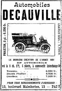 La société Decauville, via sa filiale Société des voitures automobiles Decauville, s'est engagée dans l'automobile aux côtés de la société De Dion-Bouton pour laquelle elle avait réalisé 3000 tricycles à moteur. Après plusieurs années d'études, Decauville présenta sa Voiturelle (1898-1903)[13],[14]. Ce petit véhicule de trois places, conçu à Bordeaux par deux ingénieurs des Messageries maritimes, était doté d'un moteur à essence. Decauville étudia un nouveau châssis qui fut présenté en 1902 au salon du cycle. Étonnamment modulaire (il était possible d'interchanger banquettes et moteurs), ce modèle Decauville 1902 connut un grand succès. Pourtant dès 1907 les commandes diminuent et une crise s'amorce. Le peu de réactivité de Decauville entraîna l'arrêt de l'activité de la branche « automobile » en 1909. La vente de modèles en stock se poursuivit toutefois jusqu'en 1911.