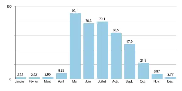 Le débit moyen mensuel observé en février (minimum d'étiage) est de 2,22 m3/s, soit 2,5 % du débit moyen du mois de mai (79,1 m3/s), ce qui souligne l'amplitude importante des variations saisonnières. Ces écarts de débit mensuel peuvent être plus marqués encore d'après les années : sur la durée d'observation de 18 ans, le débit mensuel minimal a été de 1,00 m3/s en , tandis que le débit mensuel maximal s'élevait à 258 m3/s en .