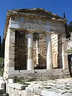 Le trésor de l'île de Siphnos (vers 525 av. J.-C.) élevé par les habitants de l'île, est un véritable écrin architectural où le goût de l'ordre ionique pour le décor ornemental et sculpté est porté à son comble ; la frise est continue, chaque côté de l'édifice étant consacré à un épisode : l'un des plus vivants montre les Olympiens décidant du sort de Troie, assis, bavardant, gesticulant, tandis que, devant eux, les Grecs et leurs ennemis se battent furieusement. Mentionné par Hérodote puis par Pausanias dans sa Périégèse, il fut redécouvert lors des fouilles de l'École française d'Athènes en 1893.
