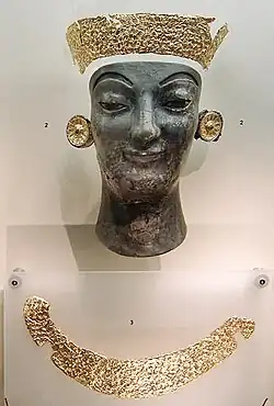 Une statue en ivoire d’une divinité masculine (Apollon ?) de stature droite, tenant une lance, et l’autre main posée sur la tête d’un fauve qu’il domine. Ce thème est emprunté à l’iconographie orientale. Le dieu est d’une taille très importante ; en partie basse, une petite ceinture où l’on retrouve un décor typiquement grec : le « méandre » (VIIe siècle av. J.-C.).