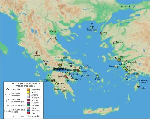 - Sanctuaires panhelléniques : Olympie (Zeus), Némée (Zeus et Héraclès), Isthme de Corinthe (Poséidon), Éleusis et Samothrace cultes à mystères), Épidaure (Asclépios)