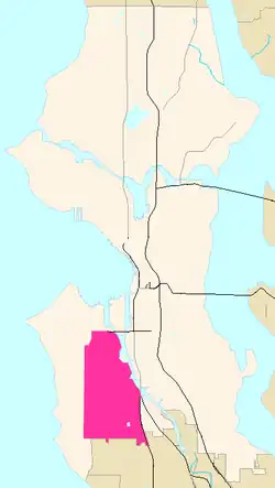 Il s'étend le long de Delridge Way, une artère qui suit le versant est de la vallée du Longfellow Creek (en), des environs de sa source jusqu'au West Seattle Bridge enjambant la Duwamish River.