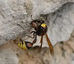 | Delta unguiculatum apportant une boulette de mortier sur son nid |